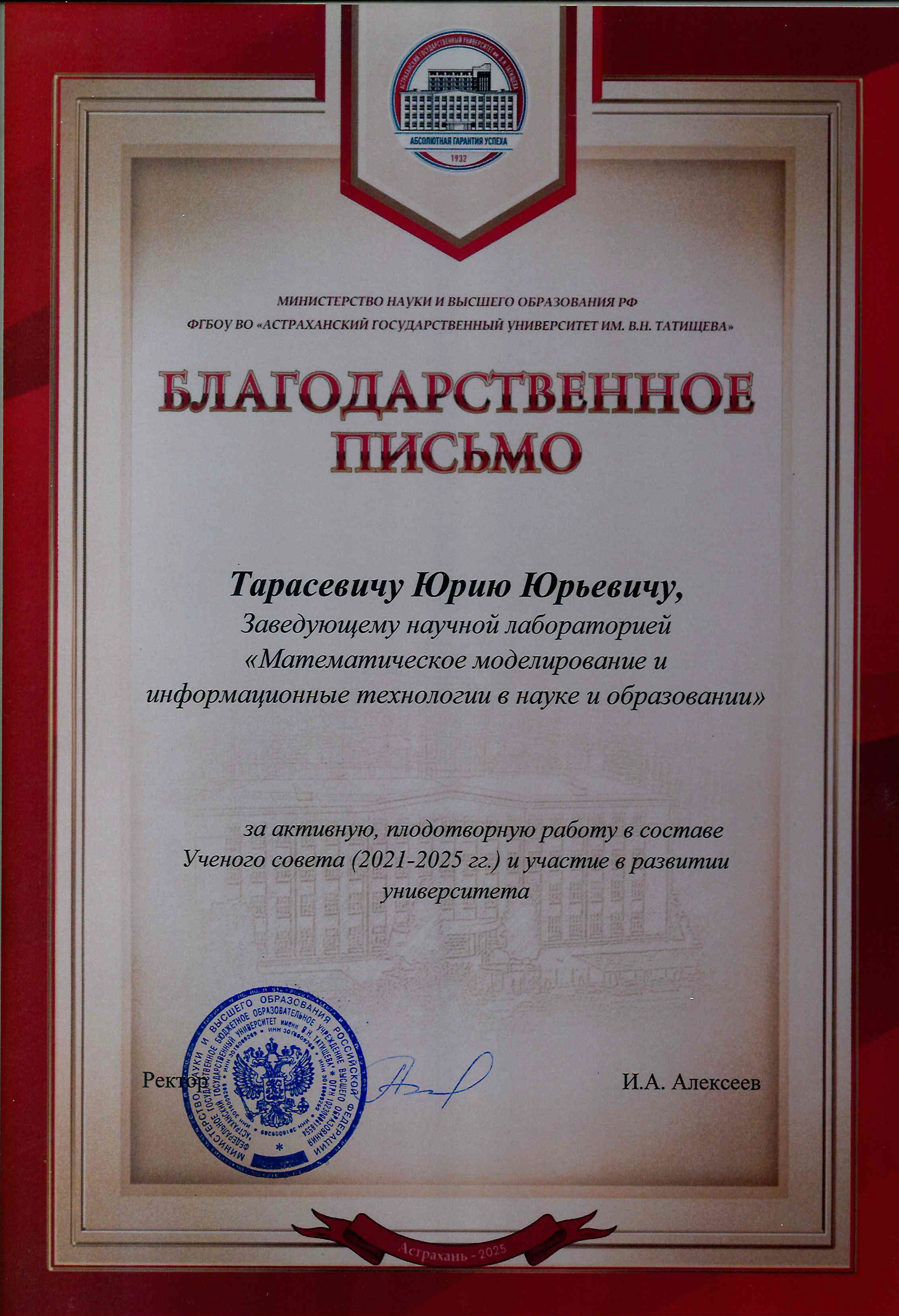 1. Ю.Ю.Тарасевич Благодарственное письмо за активную, плодотворную работу в составе Ученого совета (2021-2025) и участие в развитии университета 2025 г. (Россия, Астрахань)