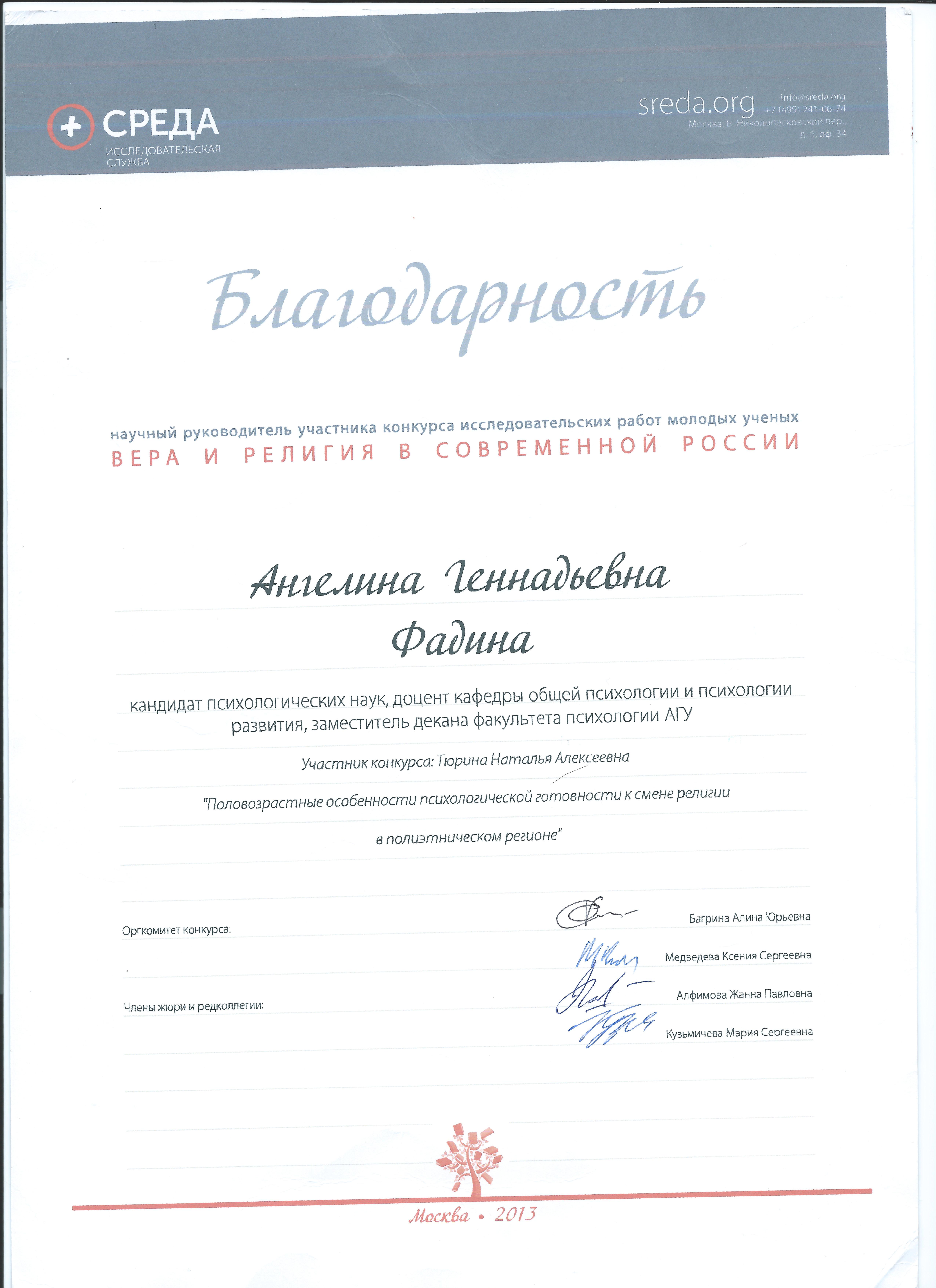 6. Фадина Ангелина Геннадьевна. Тюрина Наталья Алексеевна За подготовку студента к участию в конкурсе исследовательских работ молодых ученых 2013 г. (Россия, Москва)
