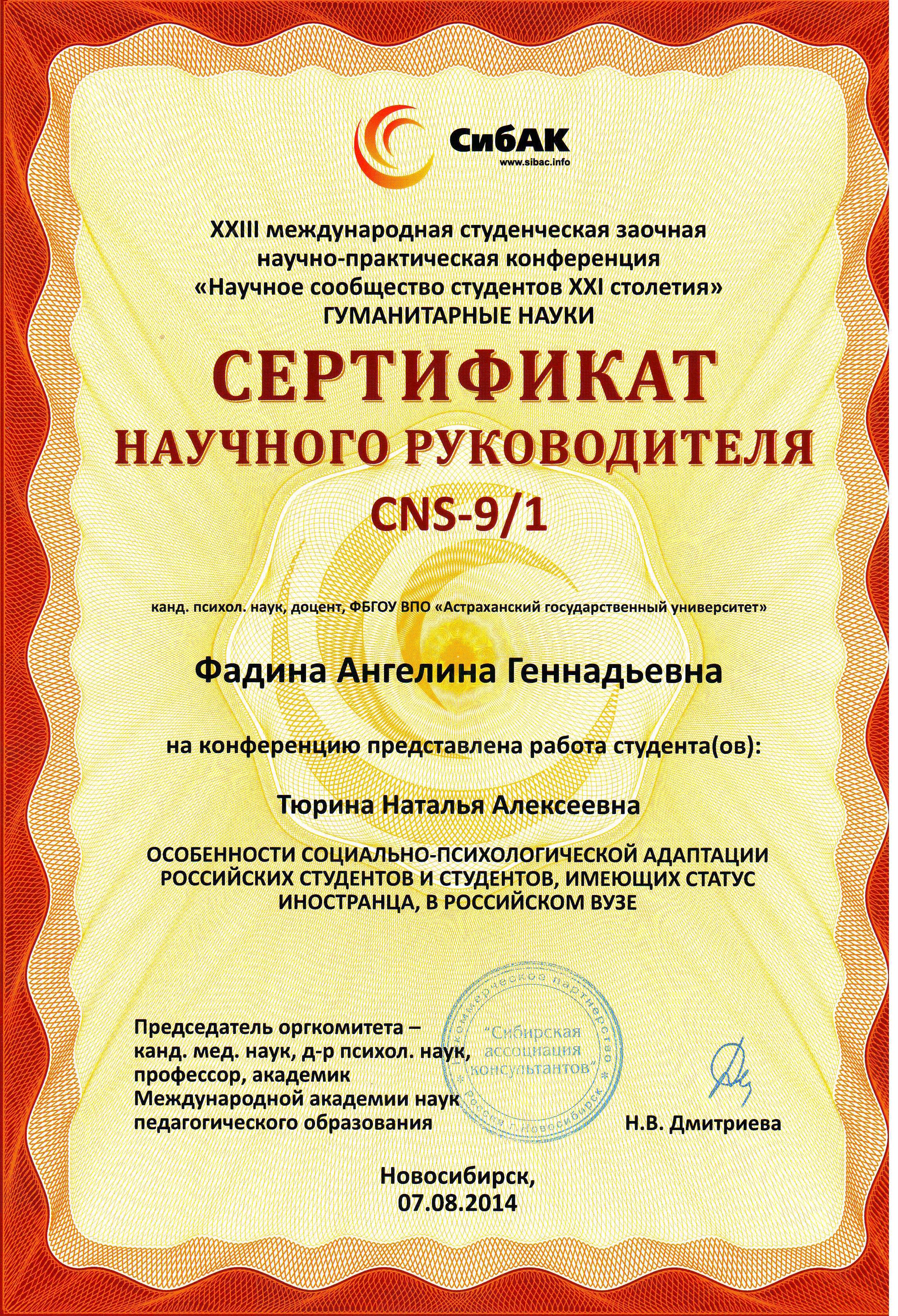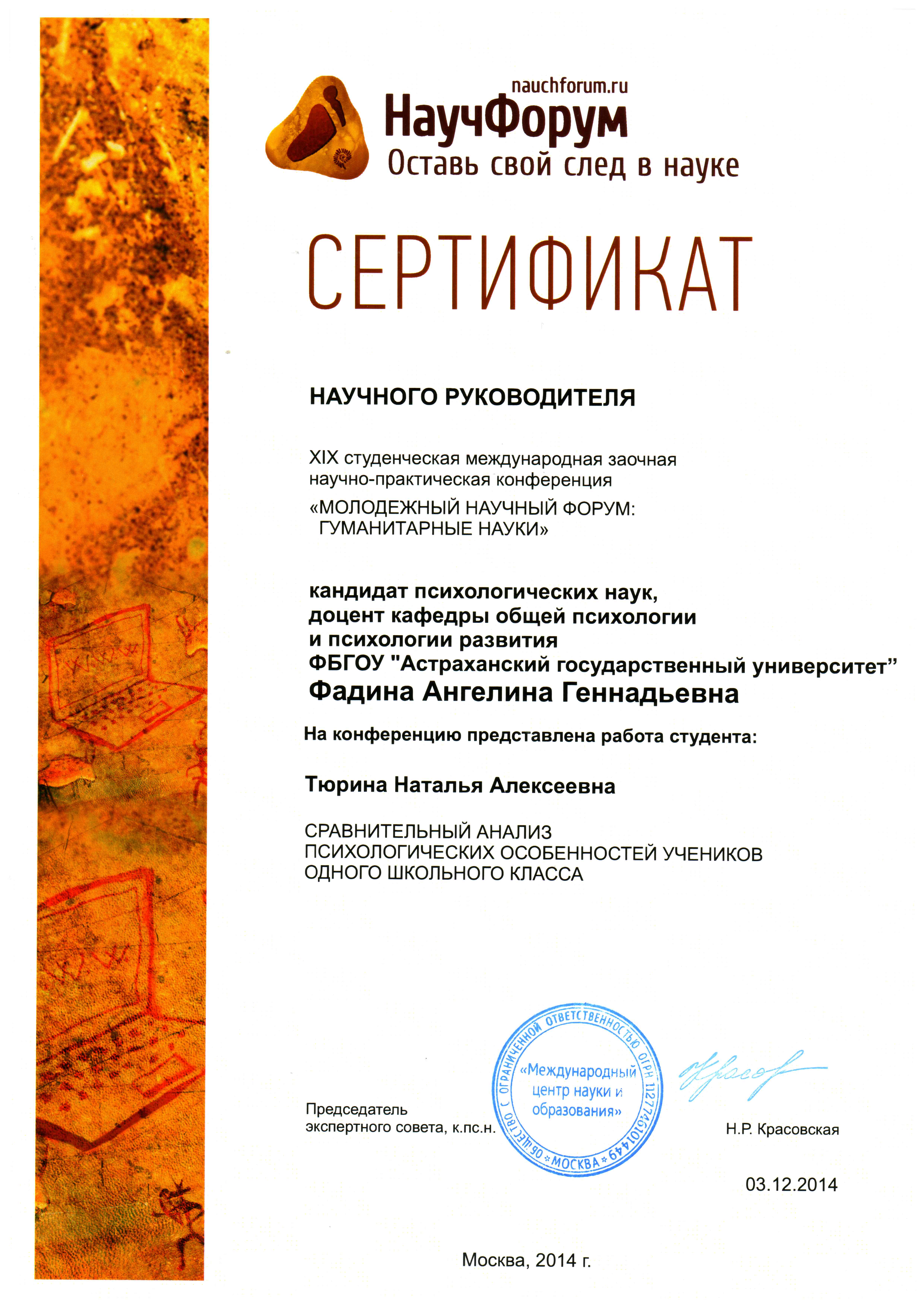 4. Фадина Ангелина Геннадьевна Сертификат научного руководителя 2014 г. (Россия, Москва)