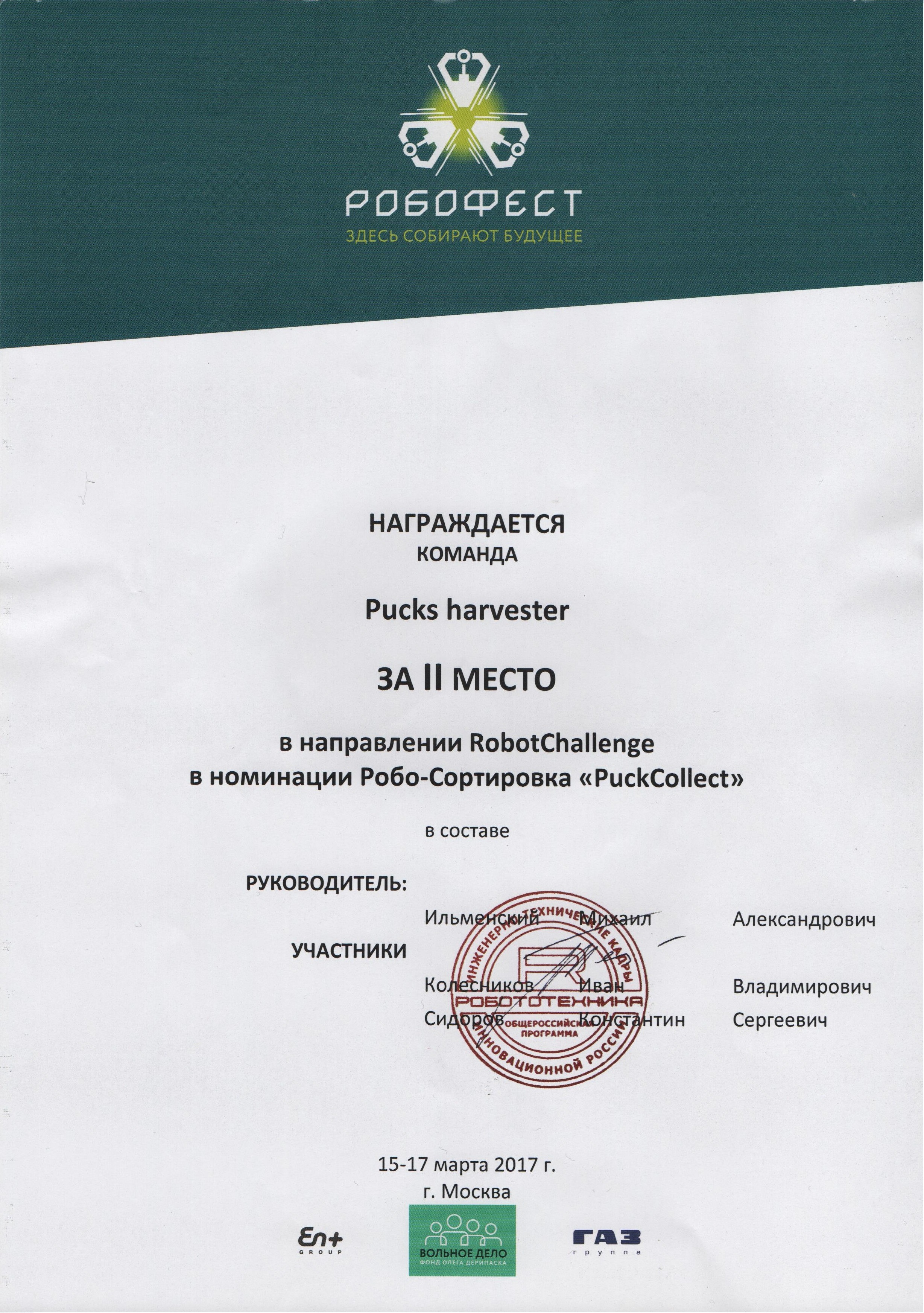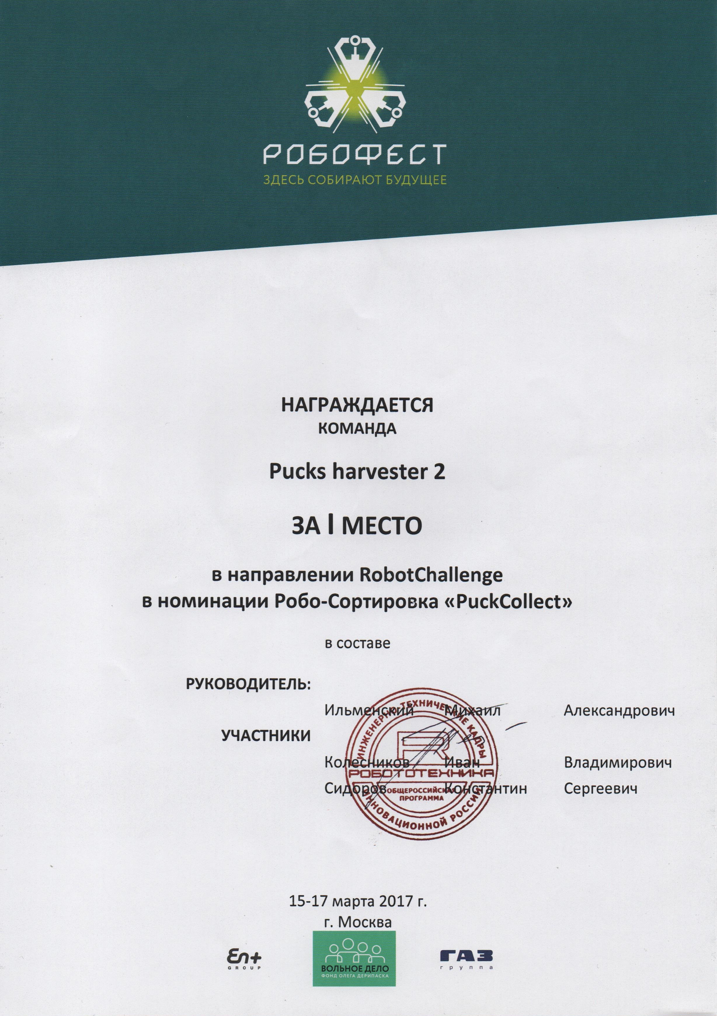 9. Ильменский М.А., Колесников И.В. Сидоров К.С. Робофест 2017 2017 г. (Россия, Москва)