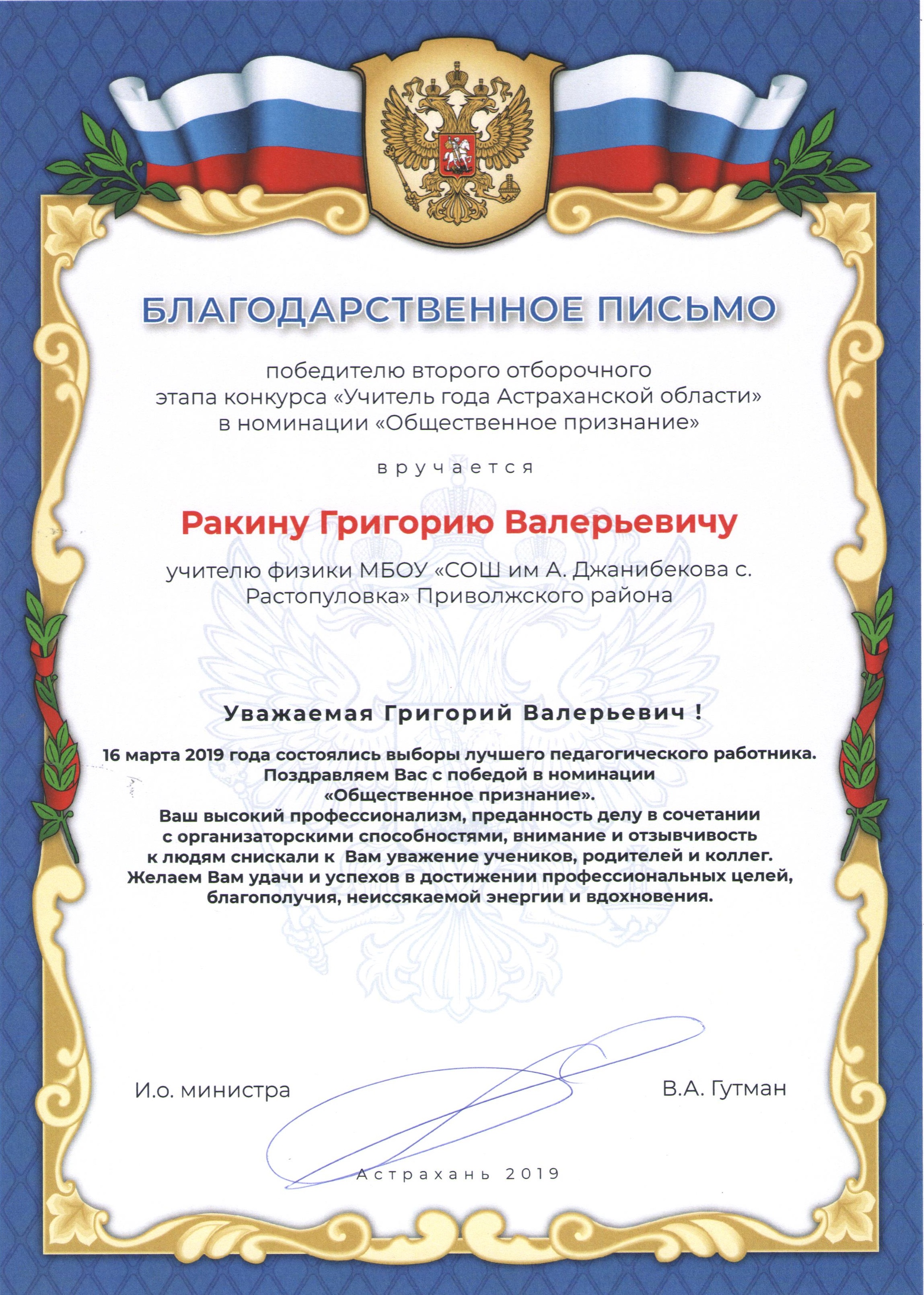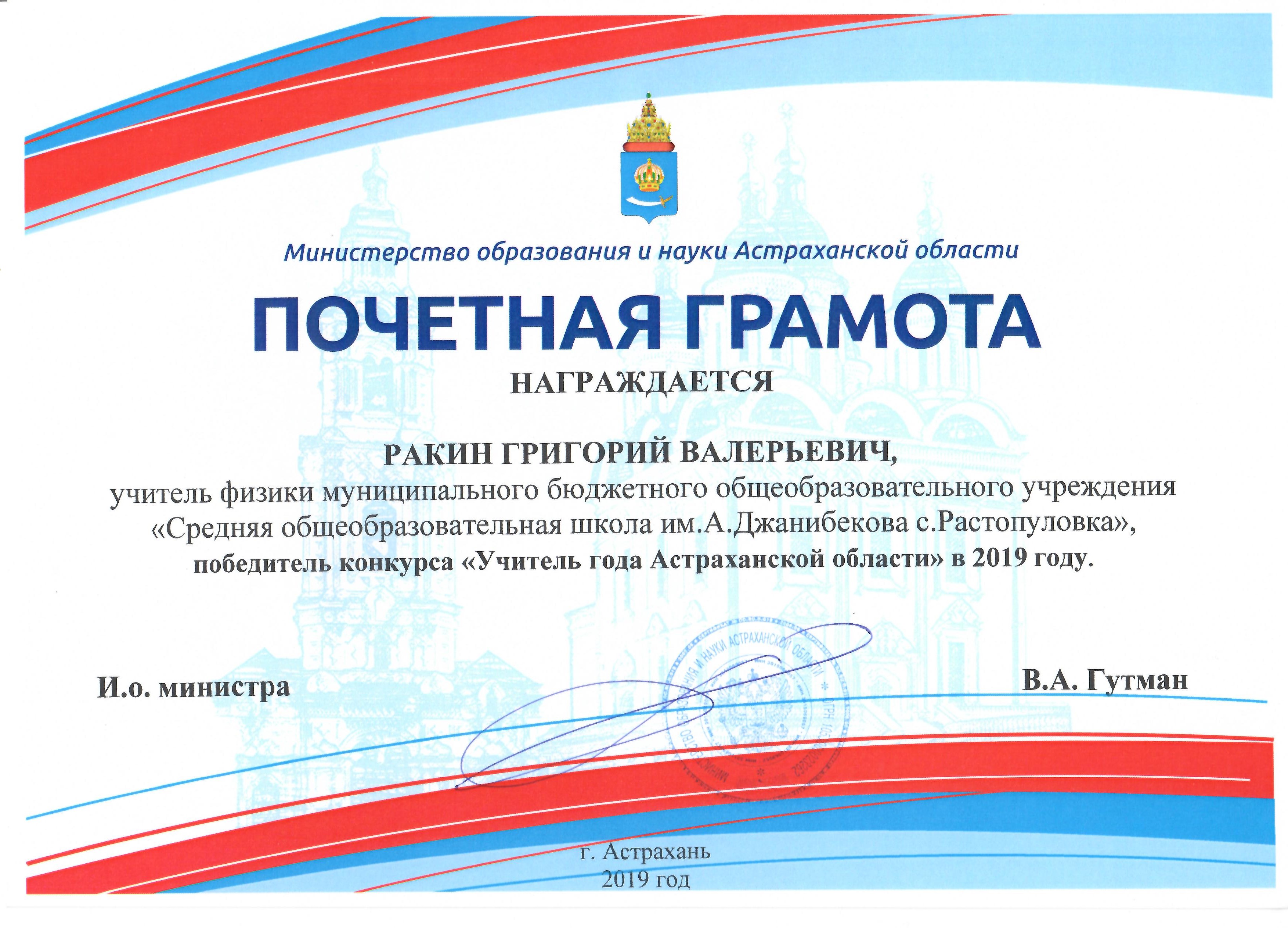 4. Ракин Г. В. Почётная грамота Министерства образования и науки Астраханской области 2019 г. (Россия, Астрахань)