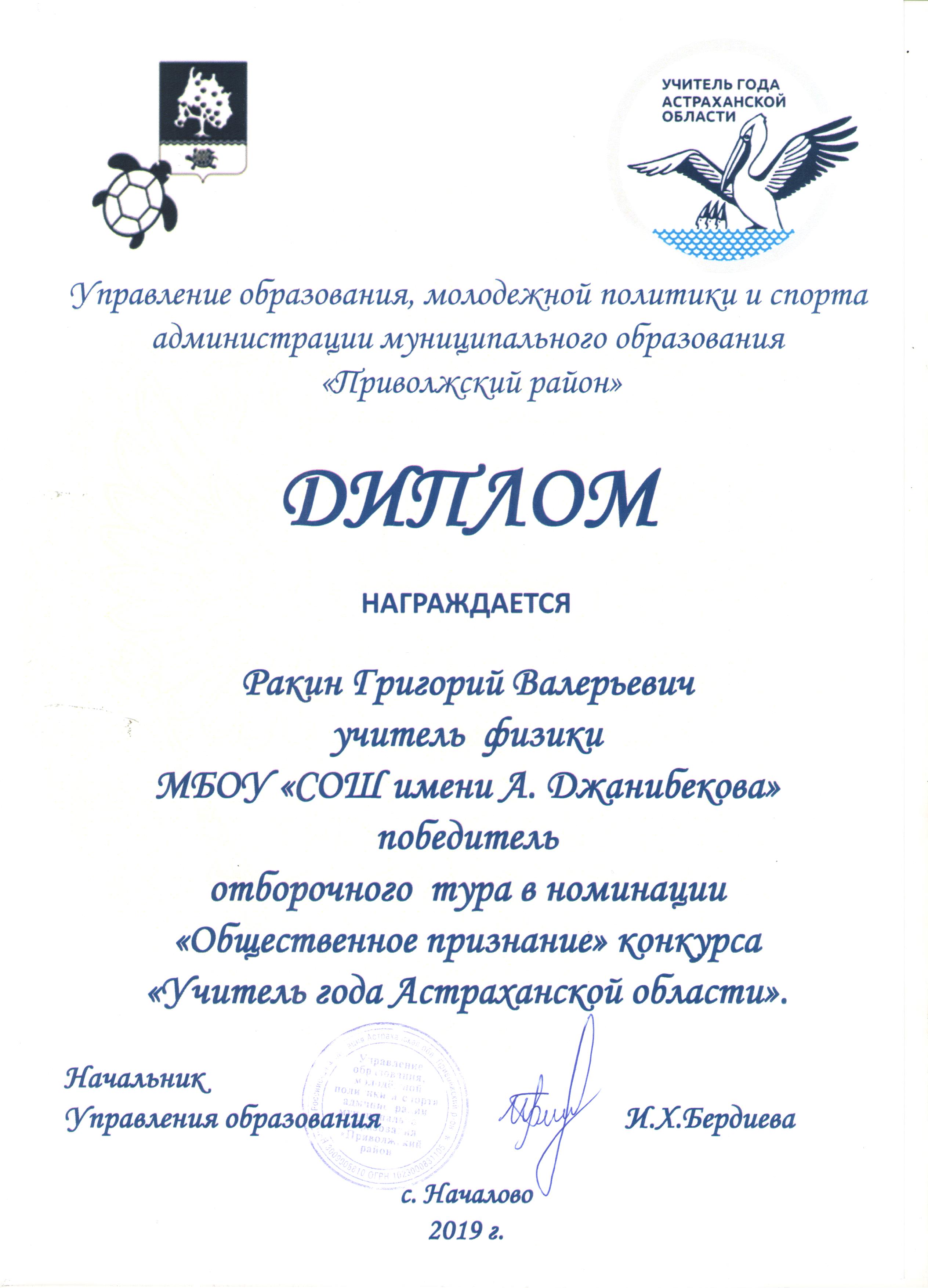 8. Ракин Г. В. Победитель муниципального этапа конкурса "Учитель года Астраханской области-2019" в номинации "Общественное признание" 2019 г. (Россия, Астрахань)