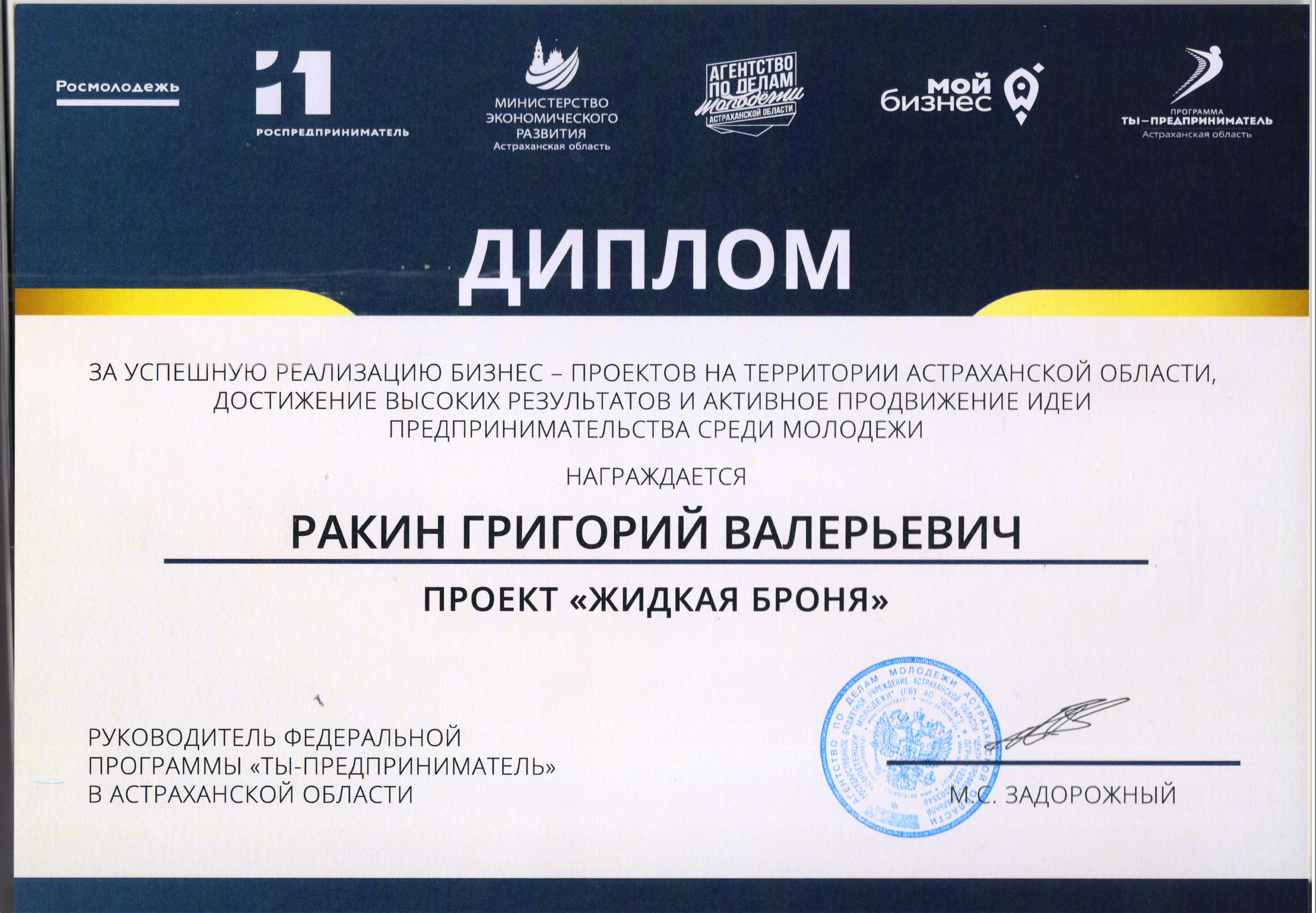 9. Ракин Г. В. Диплом за успешную реализацию бизнес-проектов на территории Астраханской области, достижение высоких результатов и активное продвижение идеи предпринимательства среди молодёжи 2019 г. (Россия, Астрахань)