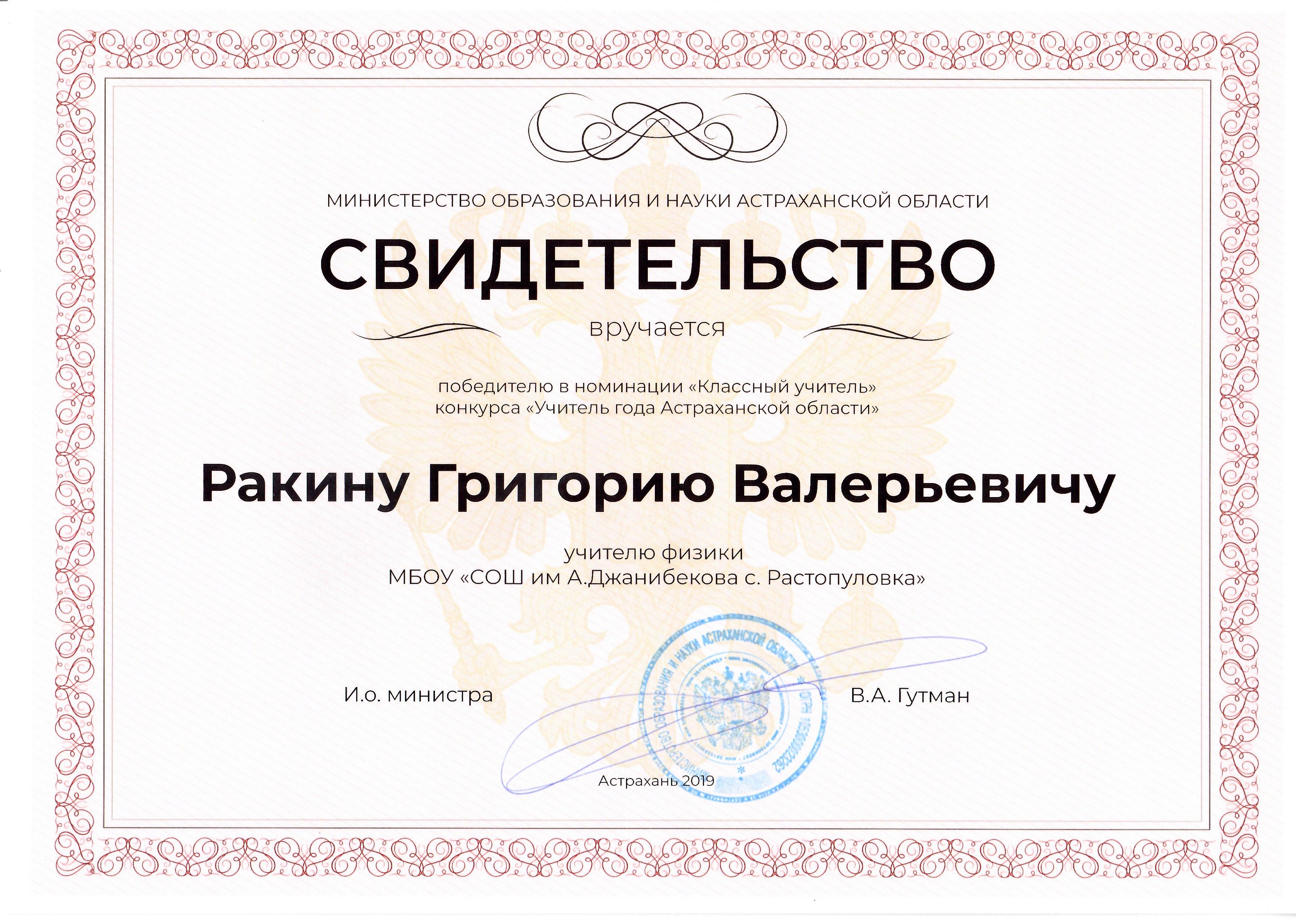 5. Ракин Григорий Валерьевич Свидетельство победителя в номинации "Классный учитель" конкурса "Учитель года Астраханской области" 2019 г. (Россия, Астрахань)