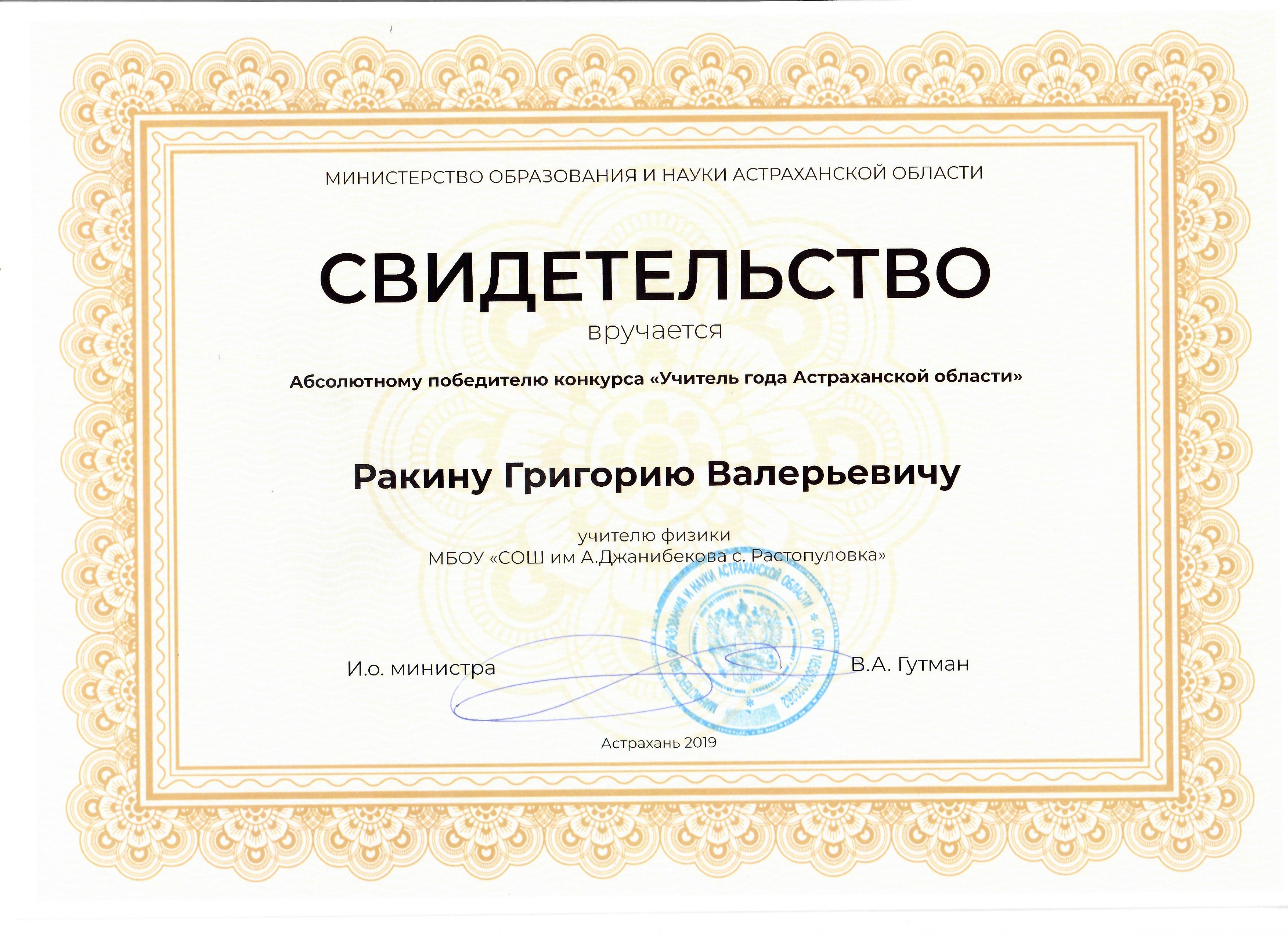 6. Ракин Г. В. Свидетельство абсолютного победителя конкурса "Учитель года Астраханской области" 2019 г. (Россия, Астрахань)
